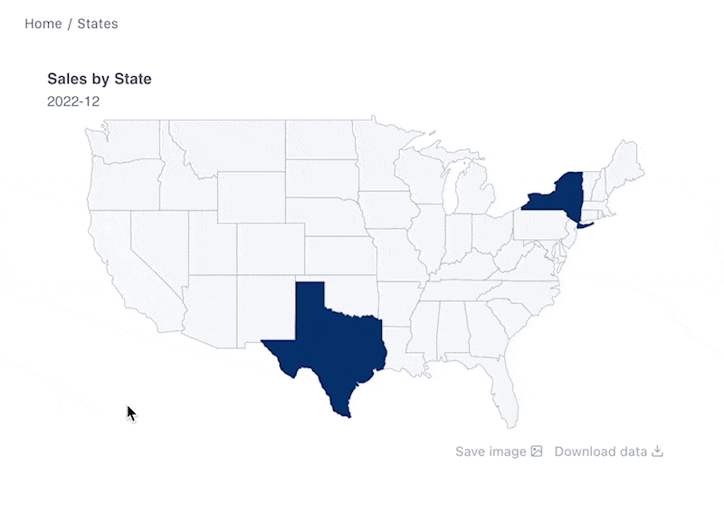 Compare a metric across US states using a flat choropleth map. For other regions see the more general Area Map component.